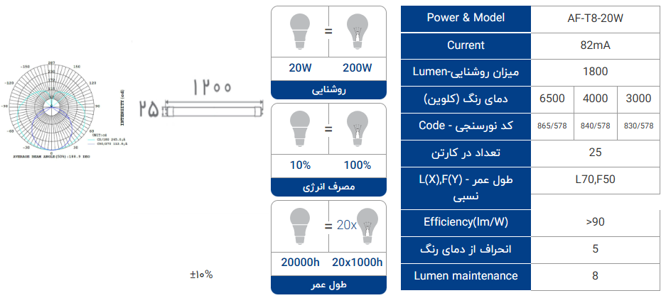 مشخصات فنی لامپ ال ای دی 20 وات T8 افراتاب