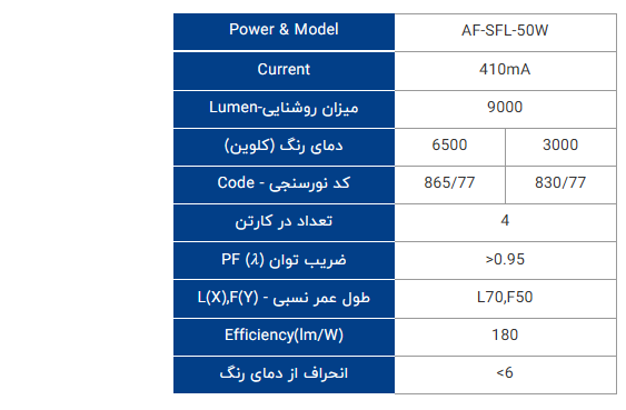 ویژگیهای فنی نورافکن 50 وات افراتاب