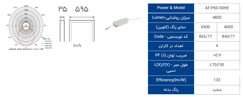 - رنگ نور: سفید طبیعی 4000 کلوین و مهتابی سرد 6500 کلوین