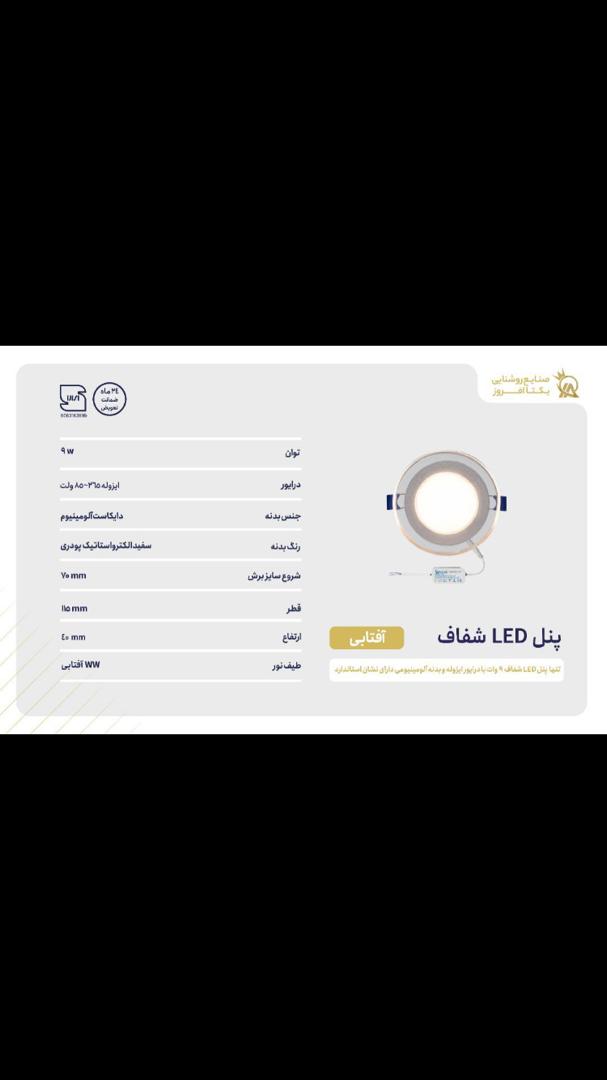 پنل LED شفاف سری گلس 9 وات نور آفتابی برند یکتا افروز