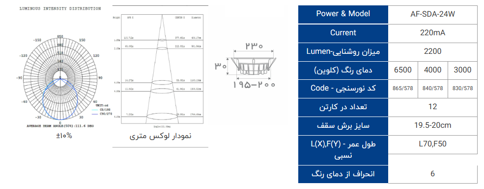 مشخصات فنی چراغ پنلی سقفی 24 وات ونوس افراتاب