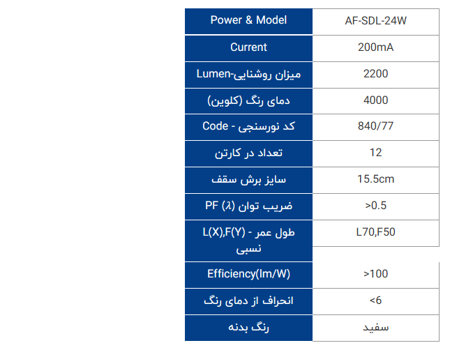 - رنگ نور: سفید طبیعی 4000 کلوین